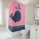 Shower curtain with a cute navy blue whale with a navy and white stars pattern water spout on a background of pink chevron stripes with a wide border of white and blue scalloped pattern design.