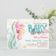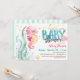 Pink seahorse under the ocean baby shower invitation. Features pink sea seahorse and aqua blue, green colours with watercolor look.
