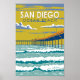 Ocean Beach San Diego in a vector art style. Surfers and sunbathers fill the namesake beach, while Ocean Beach Pier is a popular local fishing spot with sweeping views.