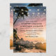 Romantic summer destination wedding invitations featuring a coastal shoreline, a beautiful sunset, string lights, and a modern wedding template for you to personalize with your own details.