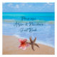 Square poster with custom printed text over a tropical ocean scene. Wedding reception poster asks guests to sign the guest book. Include names of the bride and groom. A brown starfish and pink plumeria flower represent the couple in this beach themed wedding table sign.