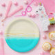 Ocean shore, teal water, sandy beach, paper plates perfect for a beach themed wedding or baby shower.