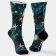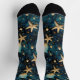 A pair of crew socks with an elegant blue pattern with starfish, representing the ocean.
