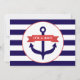 An ocean themed baby shower invitation featuring a navy blue and white striped background on front and back. Front features an illustration of a blue anchor covered with a red banner that says, "It's A Boy!"