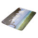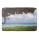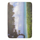 The original photograph by ZoeSPEAK on this large Bath Mat is a view of the Atlantic ocean, framed by a thick growth of sea grapes on the dunes above Juno beach. There are more sea grapes overhead, with their disc-like yellow green leaves. The sky is blue with puffy white clouds over a marine and aqua blue sea.
