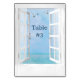 Watercolor ocean view through open white window with sheer curtains and seagulls for wedding reception.