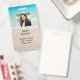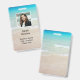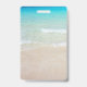 Ocean water and beach scene custom badge template with place for photo ID. Tropical ocean water and beach sand is the background for two areas of custom text. Photo is framed in white and text is printed black. Reverse has same beach scene. Choose to order a lanyard, clip or plain badge.