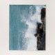 Jigsaw Puzzle. Waves crash energetically against the dark, jagged rocks, creating a frothy white spray. The sea appears in shades of turquoise, set against a clear sky barely visible at the top of the frame.