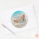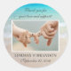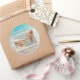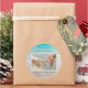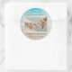 Beach wedding, photo favour labels, in a tropical theme. Ocean water and beach sand is the background image on this round sticker. Add a picture of the couple in horizontal, landscape set up, and customize with a message of thanks to wedding guests. The names of the bride and groom and wedding date will be at the bottom.