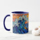 A coffee cup with an illustration of a stained glass mosaic ocean waves and sunset illustration.