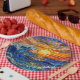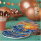 A paper plates with an illustration of a stained glass mosaic ocean waves and sunset illustration. These are perfect for a beach themed coastal birthday party.