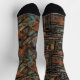 Odd but match socks, Industrial patterns in complimentary tones of blue, brown, rusty hues.