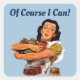 Woman wearing a ruffled apron holding glass jars of vegetables. Custom background colour. Custom text.