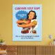 Woman wearing a ruffled apron holding glass jars of vegetables. Custom background colour. Top and bottom custom text. Customizable and removable burst bubble with custom text.