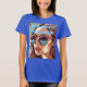 This is an Off Duty Teacher Sunglasses t-shirt. Off Duty Teacher is on the t-shirt in sky blue text. The women's t-shirt is a Women's Basic T-Shirt. The teacher and sunglasses design on the t-shirt was created with generative art. A woman is at a beach wearing sunglasses. The t-shirt is a pretty royal blue colour. You can change the text by clicking the Personalize button.
