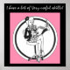 Blonde with long legs and high heels sitting in chair ready to take dictation. "I have a lot of very useful skills!" Colours are pink and black