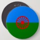Official Romany gypsy traveller flag of green and blue representing the earth and sky with a red wagon wheel, representing travel.