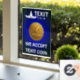 Official Logo TexitCoin We Accept Texit Coin Window Cling Dark Blue with Bright White Letters and Gold Coin