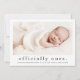 Officially Ours Photo Adoption Announcement featuring modern type and a large horizontal photo on the front. The back has a large full name header and personal message from the family. Click the edit button to customize this design with your photos and details.