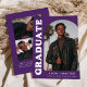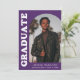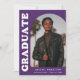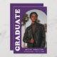 Stylish and trendy graduation announcement featuring the graduate's photo on the front with an offset arch photo frame. "Graduate" is displayed in bold white retro lettering on a purple background. Personalize the front of the arch photo graduation announcement by adding the graduate's name, school, and graduation year. The card reverses to display an additional 3 photos with space for custom text such as future college plans, career plans, graduation party details, etc. The purple graduation announcement is perfect for both high school and college graduates.