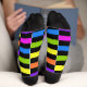 These unisex geometric socks feature offset blocks of black with bright colours of yellow, orange, green, blue, hot pink and purple.