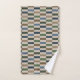This bath towel set features offset blocks or stripes in slate blue, forest green, brown, beige and tan.