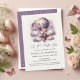 Captivating "Let the Adventure Begin" themed baby shower invitation with an adorable fox holding a teddy bear riding in a purple hot air balloon. The watercolor sky background is purple with white clouds with surrounding gold stars and a moon. White star pattern on solid purple on the back of invite. Templates provided.