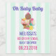 A personalized wine bottle label for baby shower prizes/favours. Perfect for an ice cream social themed party. Text at the top says: Oh baby Baby with your personalized event details. Illustrated with a bowl of ice cream with 3 delicious scoops covered in candy sprinkles. An ice cream cone also with 3 scoops of chocolate, vanilla and strawberry. A dessert bowl filled with neopolitan flavoued ice cream with a delicious cherry on top. A green and white stripes pattern in the background.