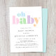 Honour the mother-to-be with this minimal modern gender neutral baby shower invitation featuring "oh baby" written in a rainbow of large pastel teal, blue, green, pink, purple and orange letters.