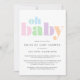This minimal modern and gender neutral invite features "oh baby" in a rainbow of pastel teal, blue, green, pink, purple and orange large typography. You can easily personalize with the drive by shower details, including where and when to drive by, areas for a gift drop off and treats, whether she will open the gift then or host an online event to unwrap the gifts, registry information and a contact for more information.