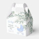 Adorable baby shower favour box to say thank you to guests for attending your baby shower! Perfect for those expecting a baby boy. Light green eucalyptus leaves surround the top all around, the front holds your personalized text and a blue baby stroller with tiny baby feet sticking out of the top. One side holds a colourful baby mobile and the back holds a cute teddy bear.