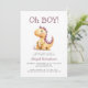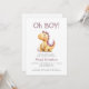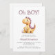 This cute baby shower invitation features an orange and purple watercolor dinosaur below the words "Oh BOY!" in purple hand printing font. Personalize the text with the name of the mom-to-be in purple and the details in charcoal grey sans serif font. The reverse side provides space for diaper raffle, books for baby, and registry details, along with a convenient QR code guests can scan to visit the registry. Ideal for a boy's baby shower.