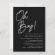 Simple baby shower invitations featuring "Oh Boy!" displayed in a bold white script with a black background. Personalize the minimalist baby shower invitations with the mother's name and shower details. The black and white baby shower invitations reverse to display your pregnancy photo and custom text. The invites are perfect for boy baby showers!