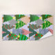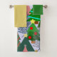 This towel set has a green washcloth, a gold hand towel, and a bath towel with a design of Christmas trees in various shades of green, pink, silver, and gold with different decorations.