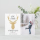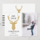 "Oh, deer Christmas is here." Enjoy this modern design with a faux glitter gold deer head silhouette. The card also features a place for you to put a picture with a white border on the inside of the picture.