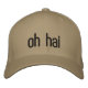 Fits well due to elastic edging, not adjustable. Good qualty material. Good quality embroidering. Subtle lettering (white on beige) just as my wife likes.