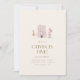 Ce charmant invitation de fête d'anniversaire, d'inspiration française, présente une mignonne illustration dessinée à la main d'une scène de rue parisienne pittoresque. Un bâtiment à la française fantaisiste, se trouve à côté d'une belle jeune femme en robe rose. De l'autre côté, un mignon caniche est assis avec des ballons roses. Les teintes pastel douces et les détails délicats évoquent le romantisme d'un café parisien. En dessous de la scène, les détails de la fête sont élégamment exposés dans un scénario ludique mais raffiné, invitant à la fête avec une touche de français.