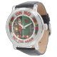 This image features a OH NO "NOT YOU AGAIN" Watch with a humorous, non-traditional Christmas theme. The central illustration shows an angry-looking elf peering out from a partially opened green door, holding an antique lantern. The watch face is surrounded by a white ring containing the black hour markers and watch hands. The border features festive greenery, poinsettias, candy canes, and large red and gold ornaments. Humorous red text is boldly displayed at the top and bottom: "OH NO" (at the top) and "NOT YOU AGAIN" (at the bottom).