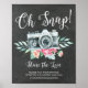 Oh Snap Hashtag Wedding Sign featuring a modern font with a gray camera with floral accent set on a black chalkboard background. Easy to change the size & customize with your information.
