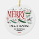 Featuring a whimsical swirled font and watercolor pine branches, berries, and holly in softer shades of deep red, dusty pine, and light blues, this Christmas or holiday ceramic keepsake ornament is perfect for newlyweds celebrating their first Christmas as a married couple! Also great for an engagement gift! Coordinates with our Let's Get Merry collection.