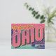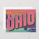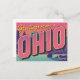 This ultra-modern, retro-style design features the iconic "Greetings from OHIO" typography in bold pink and purple hues. The backdrop is a vibrant, mid-century-inspired cityscape and bridge over water, reflecting a major urban center like Cleveland, Columbus, or Cincinnati. The unique color palette gives this vintage travel art a distinct Pop Art aesthetic. Perfect for fans of bold, colorful designs, urban landscapes, and the Buckeye State.