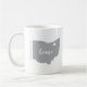 A simple mug with an outline of the state of Ohio and beautiful lettering for the word "home" placed in the center. Personalize this mug by inserting your hometown & customize further by placing the ♥ near your hometown on the Ohio state image. These are great gifts, keepsakes, and perfect for collections!