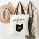 Welcome guests to your Ohio wedding with these chic and modern personalized tote bags. Design features "welcome" in modern handwritten calligraphy script, with your initials joined by a heart, along with your wedding date, inside a black silhouette map of the state of Ohio. Personalize with a specific Ohio city or location name if desired.