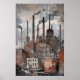 oil painting poster featuring a scenery of industrial site with factory, building, smoke in grey hues, for decorating your room.