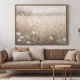 A serene winter morning envelopes a vast field of flowers and grass, as fog blankets the landscape and delicate snowflakes dance upon the plants, creating a peaceful and picturesque outdoor scene