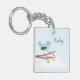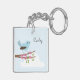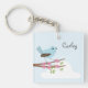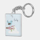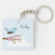 Oiseau bleu sur la branche rose de fleur. Porte - clé acrylique avec l'image et texte sur l'avant et l'inverse. Personnalisation facultative.