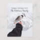 Une carte de Noël photographique moderne avec un oiseau perché à la main sur fond de montagnes, de neige et de nature sauvage. Une image époustouflante mettant en valeur la beauté de la nature.