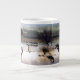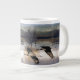 Une magnifique peinture composite numérique tirée de la photographie de Sandhill Crane Birds volant, et certains à l'aube reposant dans des eaux peu profondes, se trouve sur cette Cranesis de Sandhill sur cette Mug Jumbo.