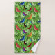 Ce kit de serviettes est doté d'un linge bleu, d'une serviette de bain bleu foncé et d'une serviette de bain aux motifs naturels d'oiseaux en feuille.