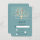 Carte RSVP avec un fond vert assourdi superposé sur un arbre jaune clair avec 2 silhouettes d'oiseaux orange perchés sur les branches.